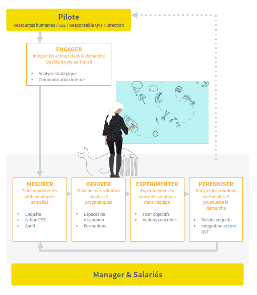 👉 Cette démarche passe par la mise en œuvre progressive d’actions favorisant le bien-être au travail, autrement dit :
